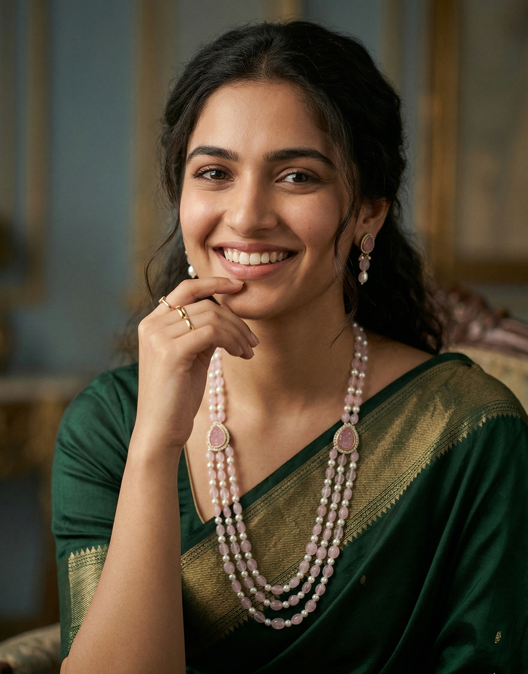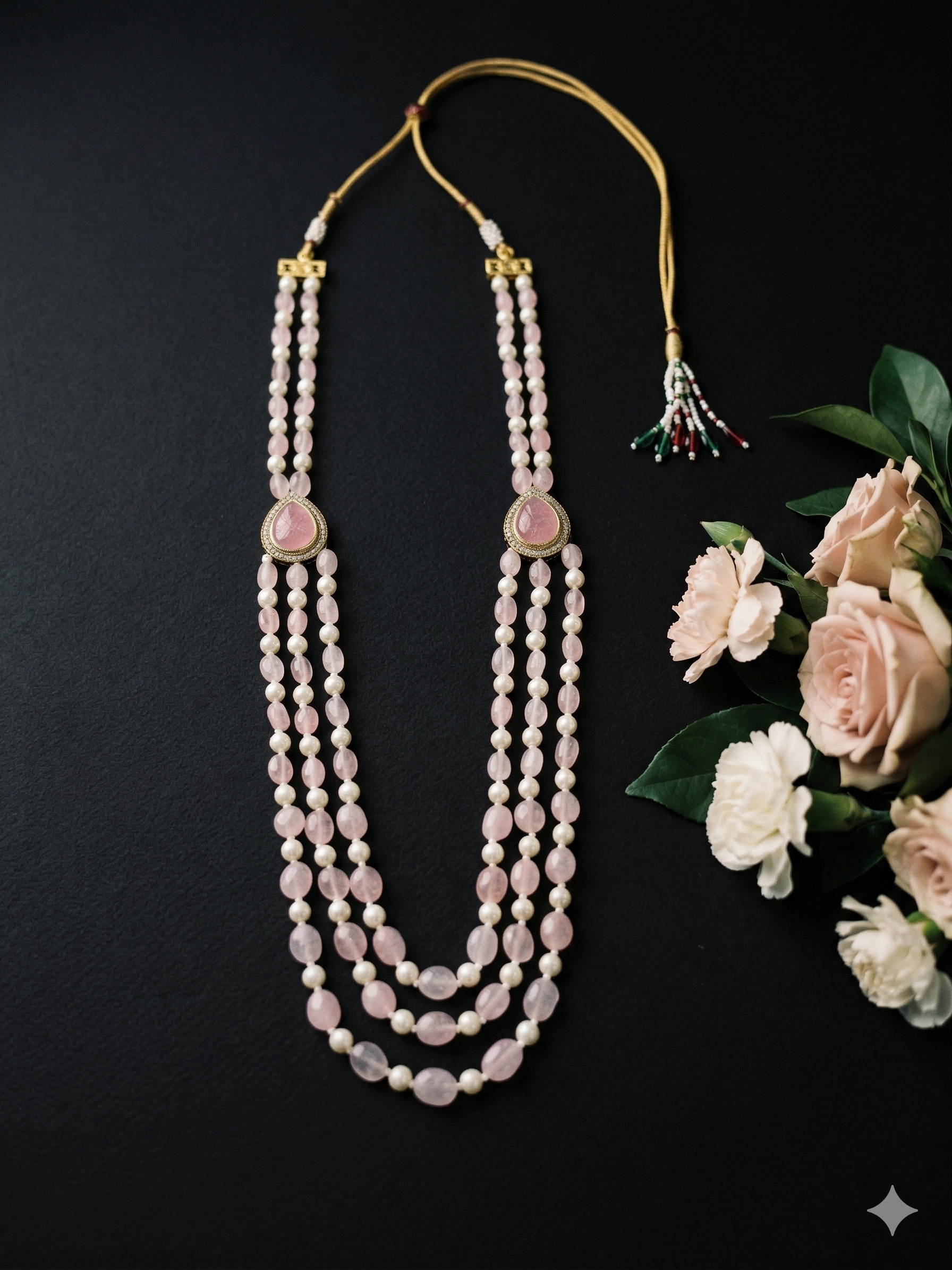 Design & Composition: The necklace consists of three draped strands of beads. It beautifully alternates between glossy white freshwater-style pearls and smooth, polished light pink coral or pink agate beads. The bottom section of each strand transitions into larger, more oval-shaped pink gemstone beads (likely strawberry quartz or dark pink agate), adding depth and a nice gradient effect to the design.