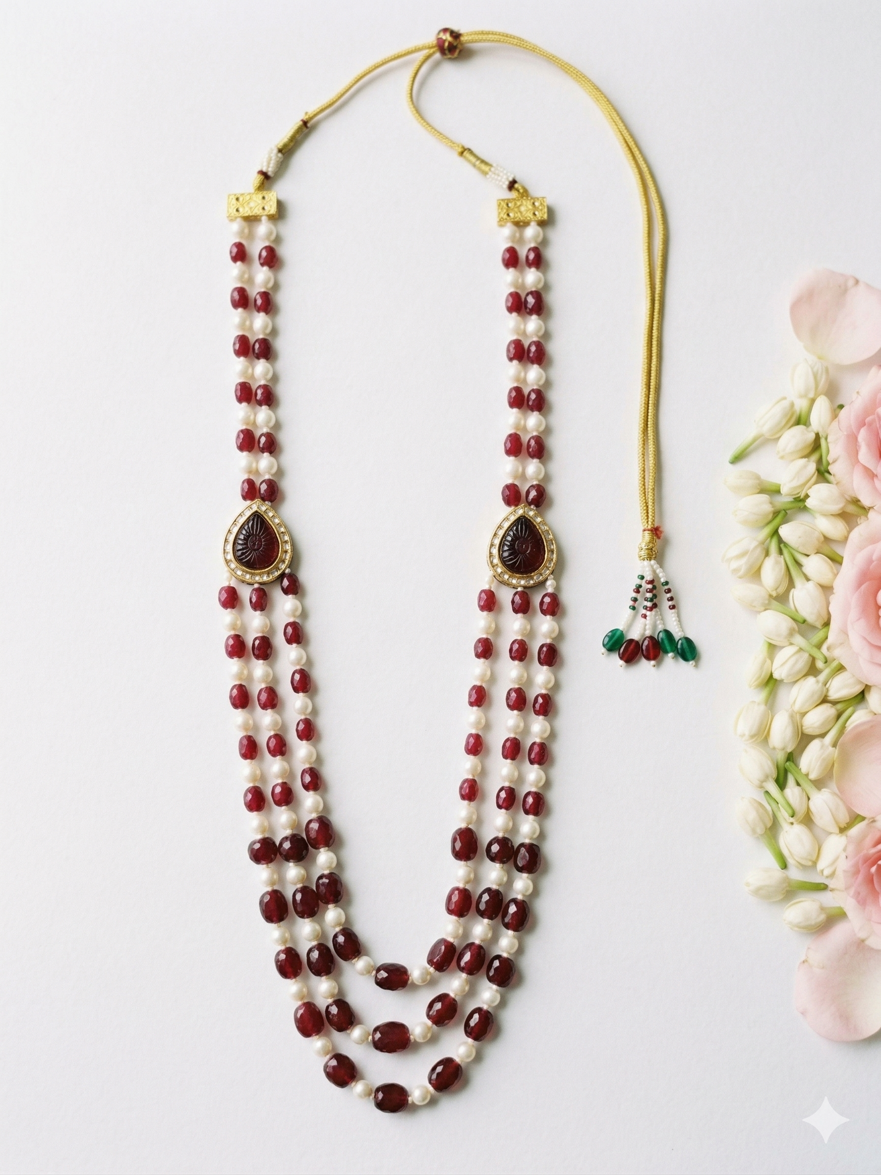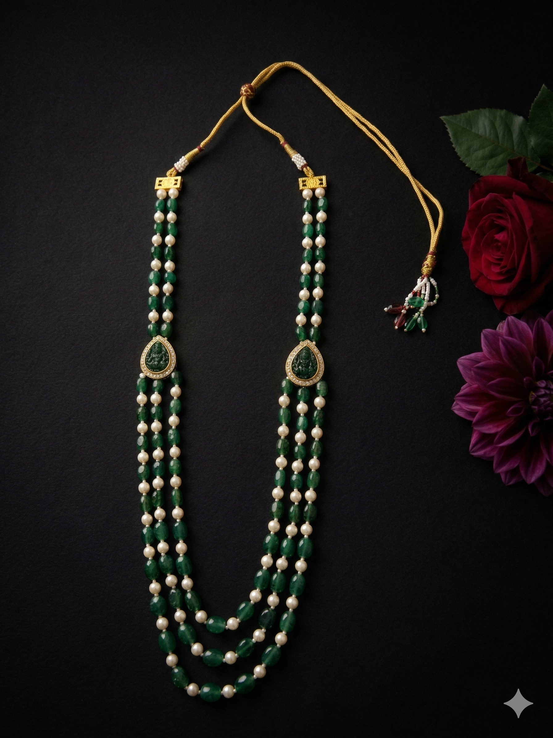 Back Tie: The necklace is finished with a traditional adjustable yellow silk cord dori, allowing you to customize the length. The ends of the cord are adorned with decorative clusters of small white, maroon, and green glass beads for a neat finish.