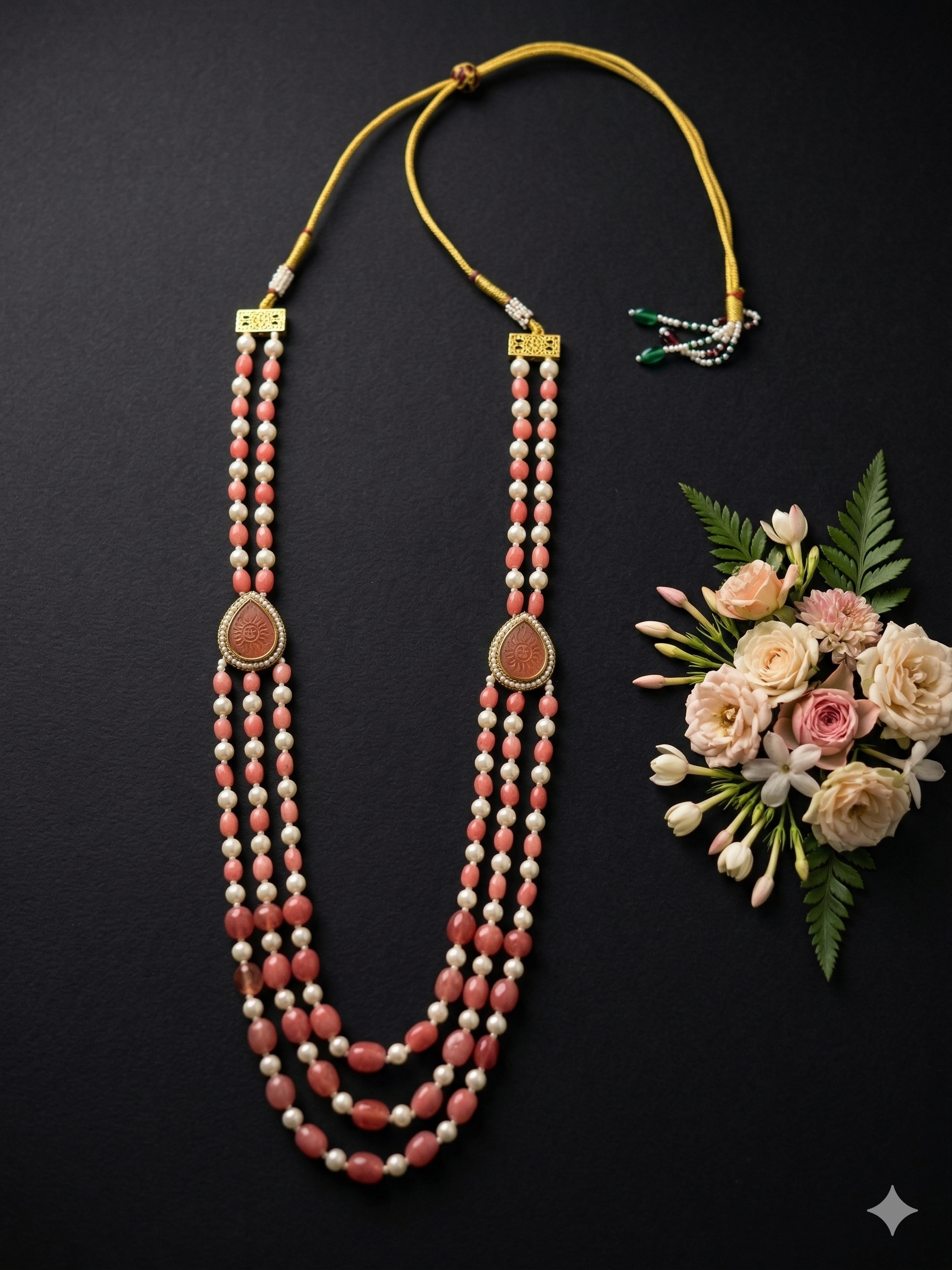 Given its length and the mix of pearls and warm-toned beads, it would be ideal for weddings, festivals, or other grand, formal events. The natural materials (pearls, coral-like stones, carved pendants) give it a sophisticated, heirloom quality.