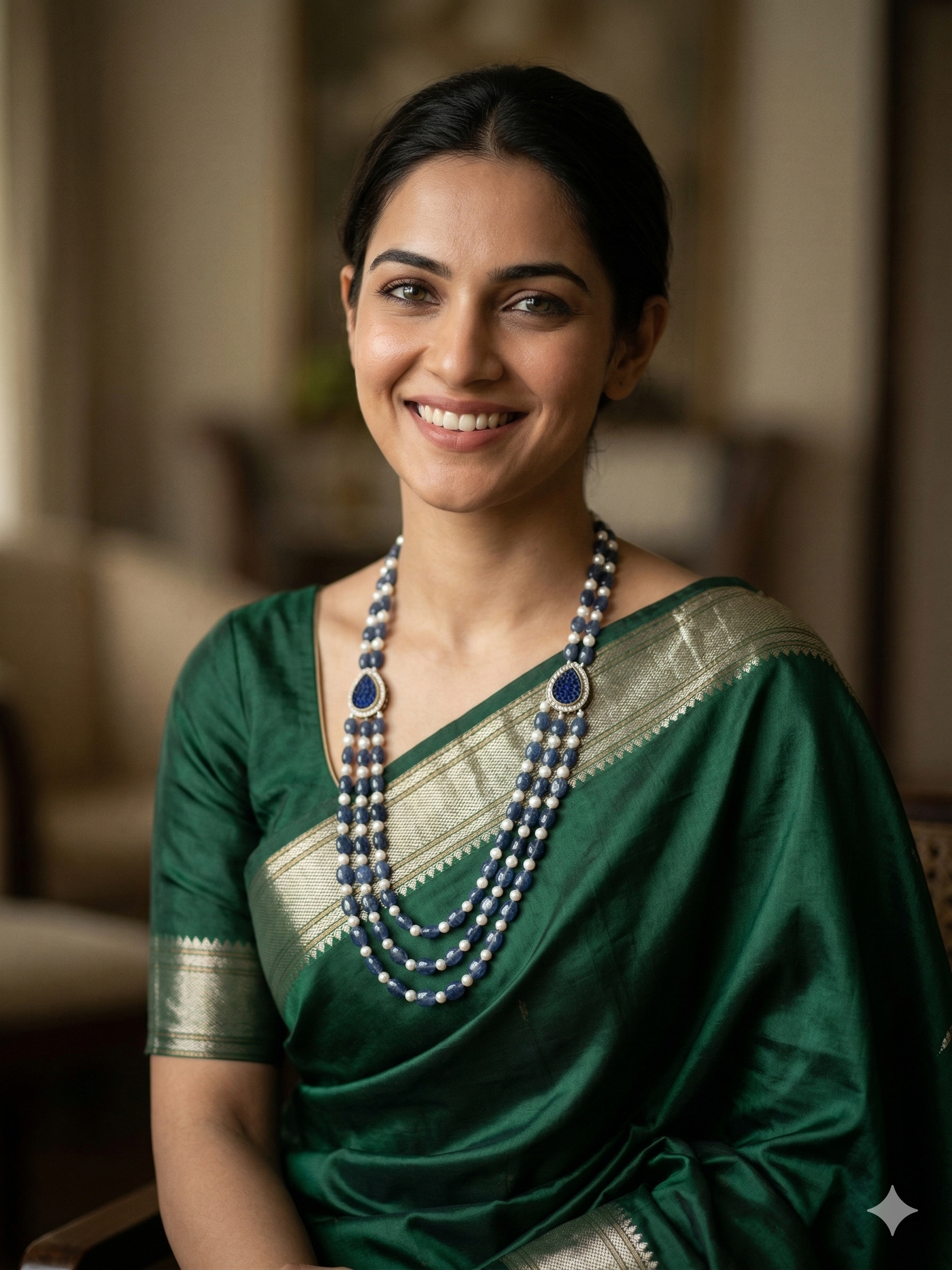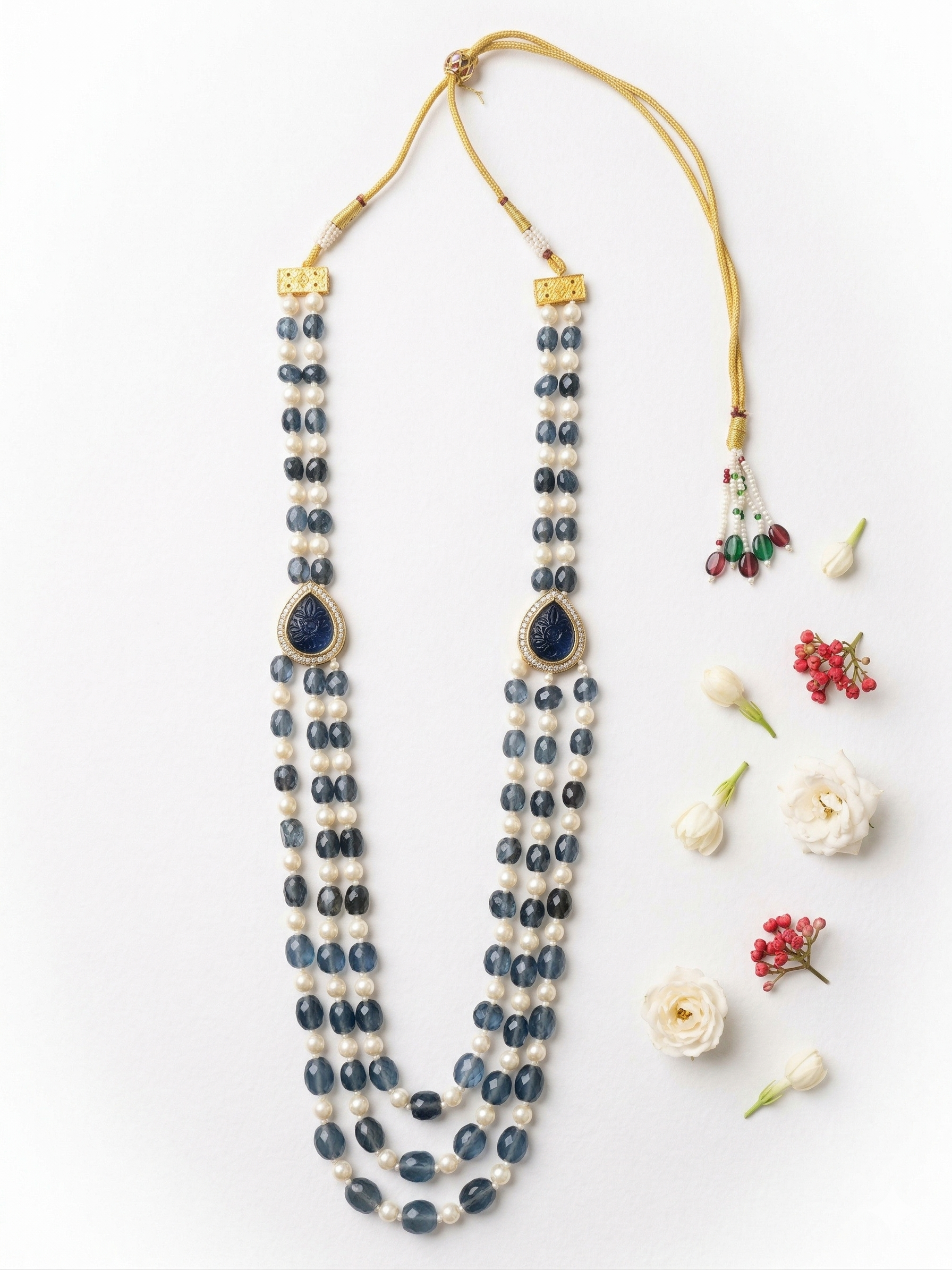 This is an elegant, multi-layered long necklace featuring a blend of traditional craftsmanship and contemporary style.
