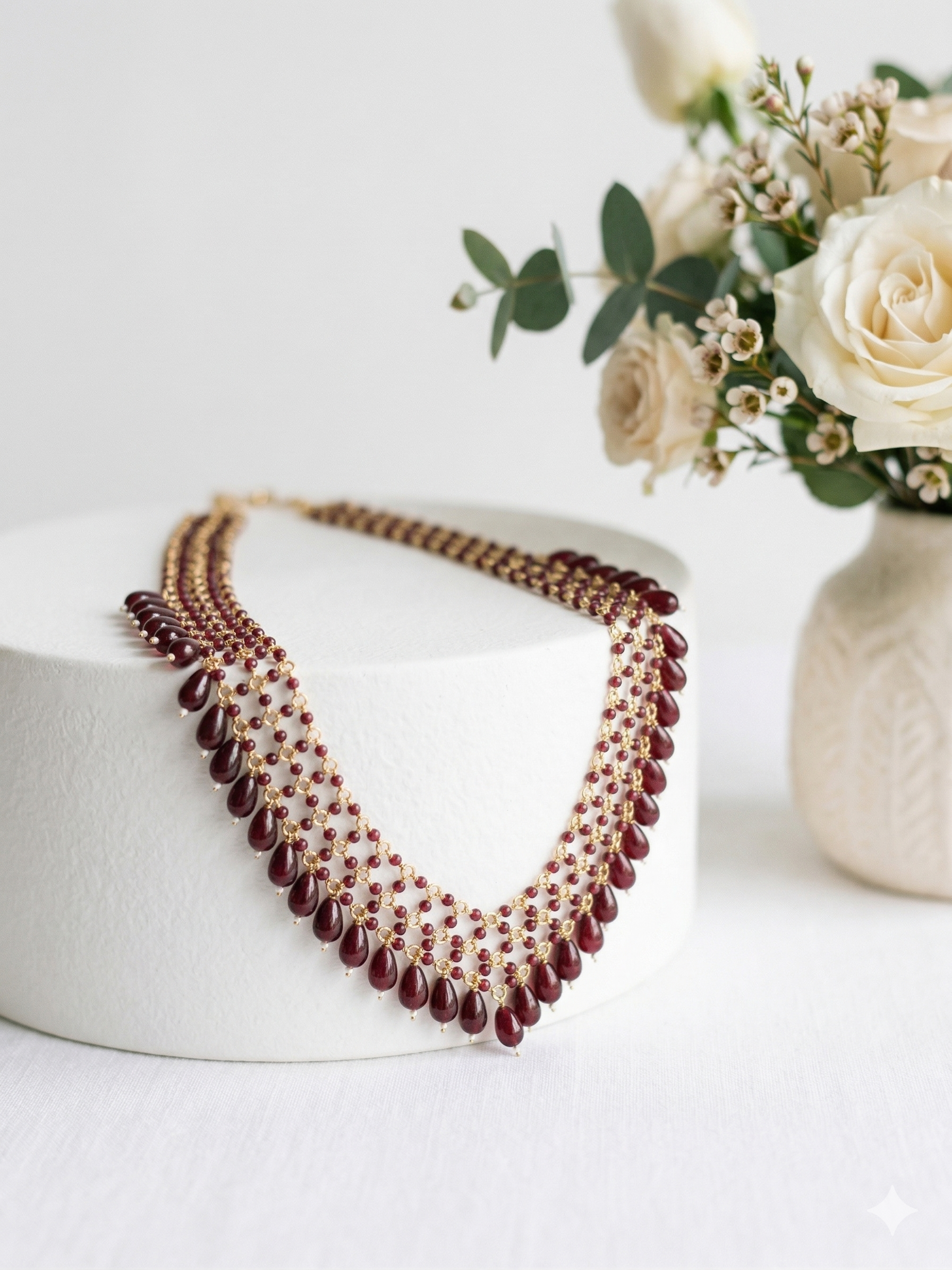 The Beads: The necklace is heavily adorned with faceted, teardrop-shaped beads. The color is a deep, rich crimson-burgundy, reminiscent of high-quality rubies or potentially garnet.