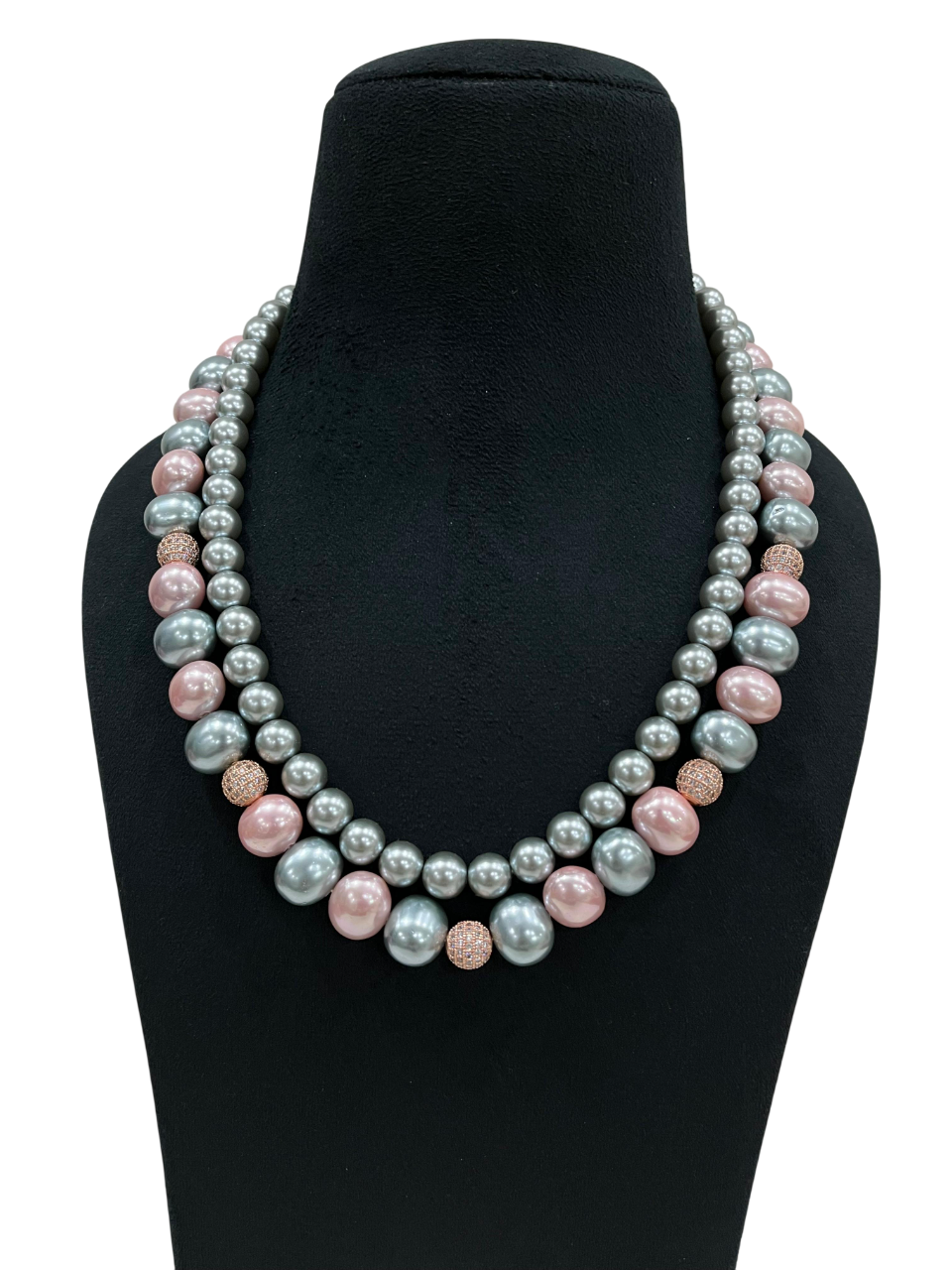 • Featuring a double-layer design, this exquisite necklace showcases a beautiful combination of pink and grey lustrous pearls in varying sizes, creating an eye-catching dimensional effect.