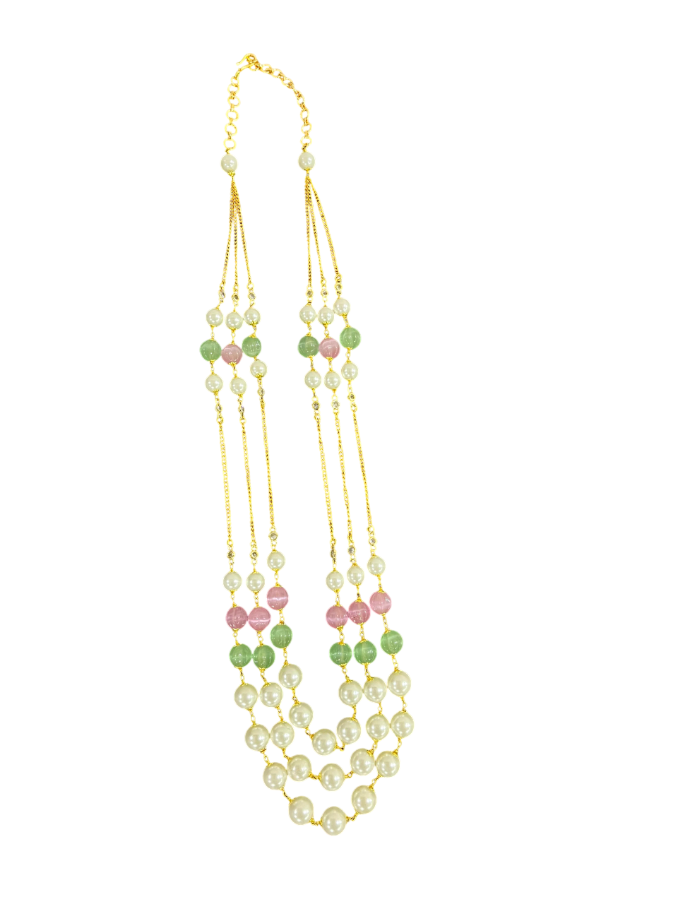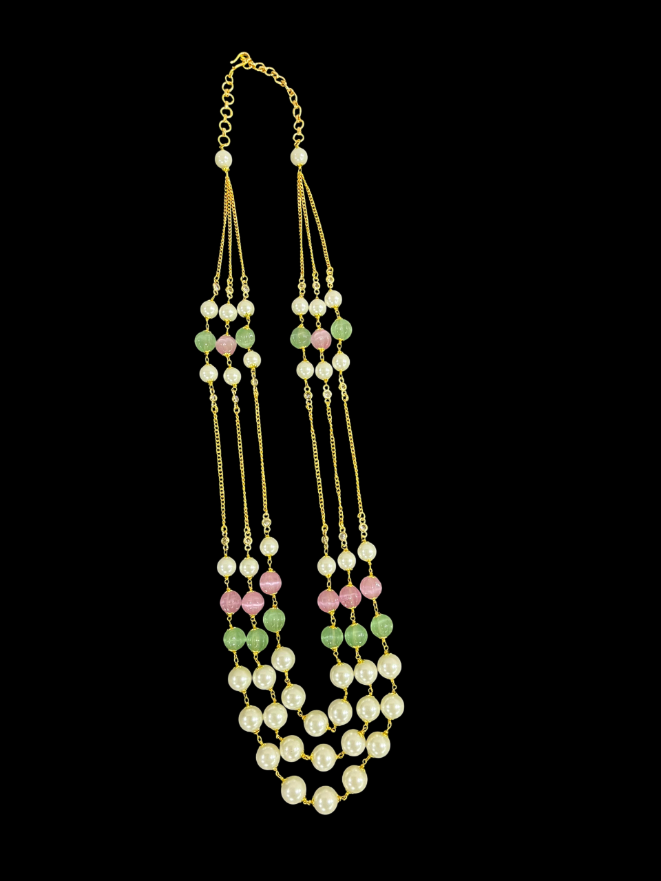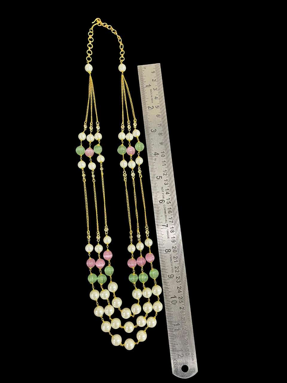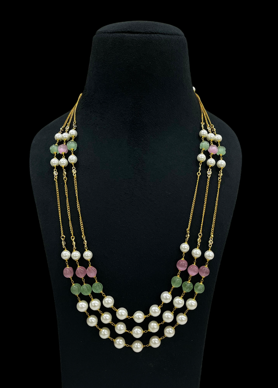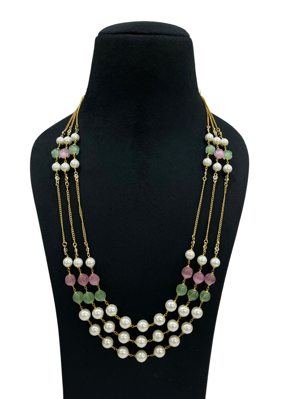 • Featuring  lustrous shell pearls in a captivating arrangement, this necklace showcases three cascading strands adorned with Natural white pearls complemented by monalisa stone accents.