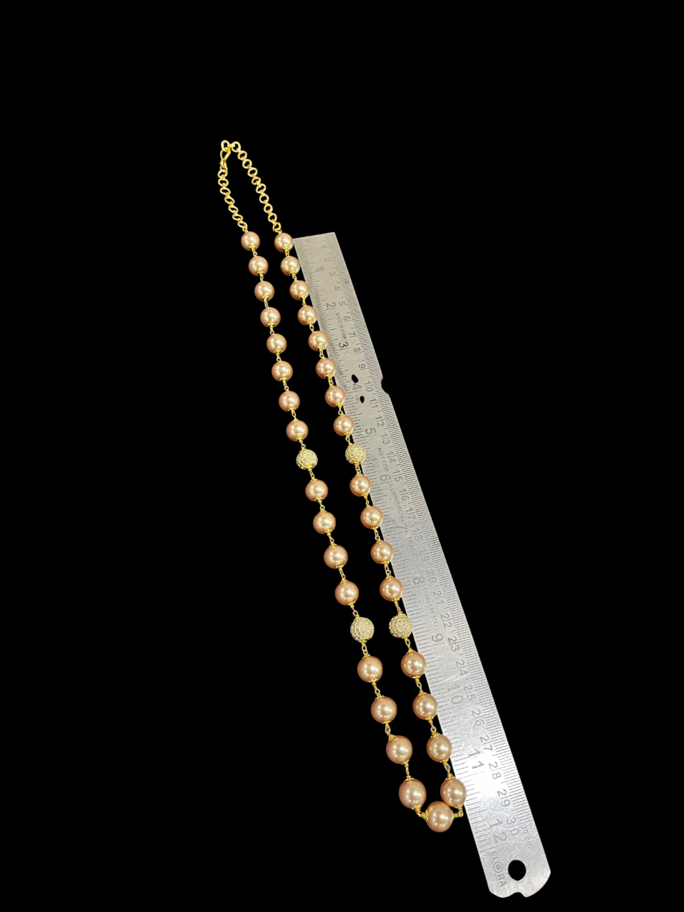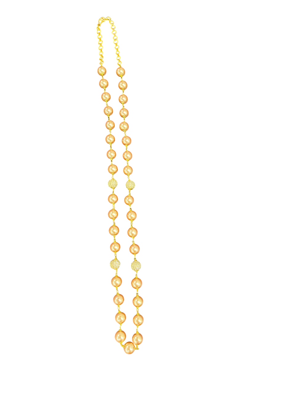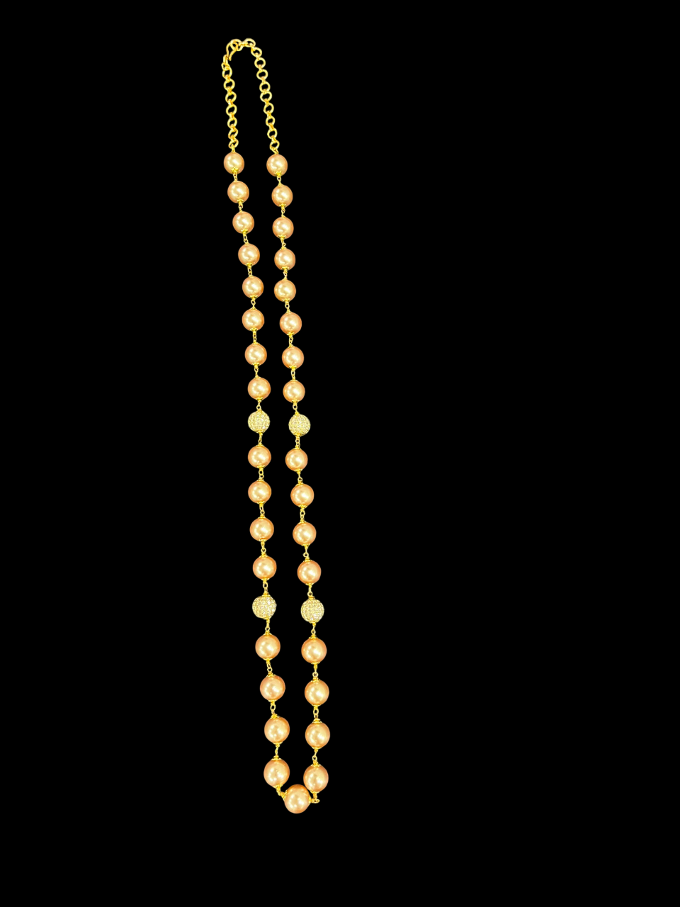 - Featuring lustrous champagne-coloured pearls elegantly strung together with delicate gold chain links, this necklace creates a beautiful contrast that catches the light beautifully.