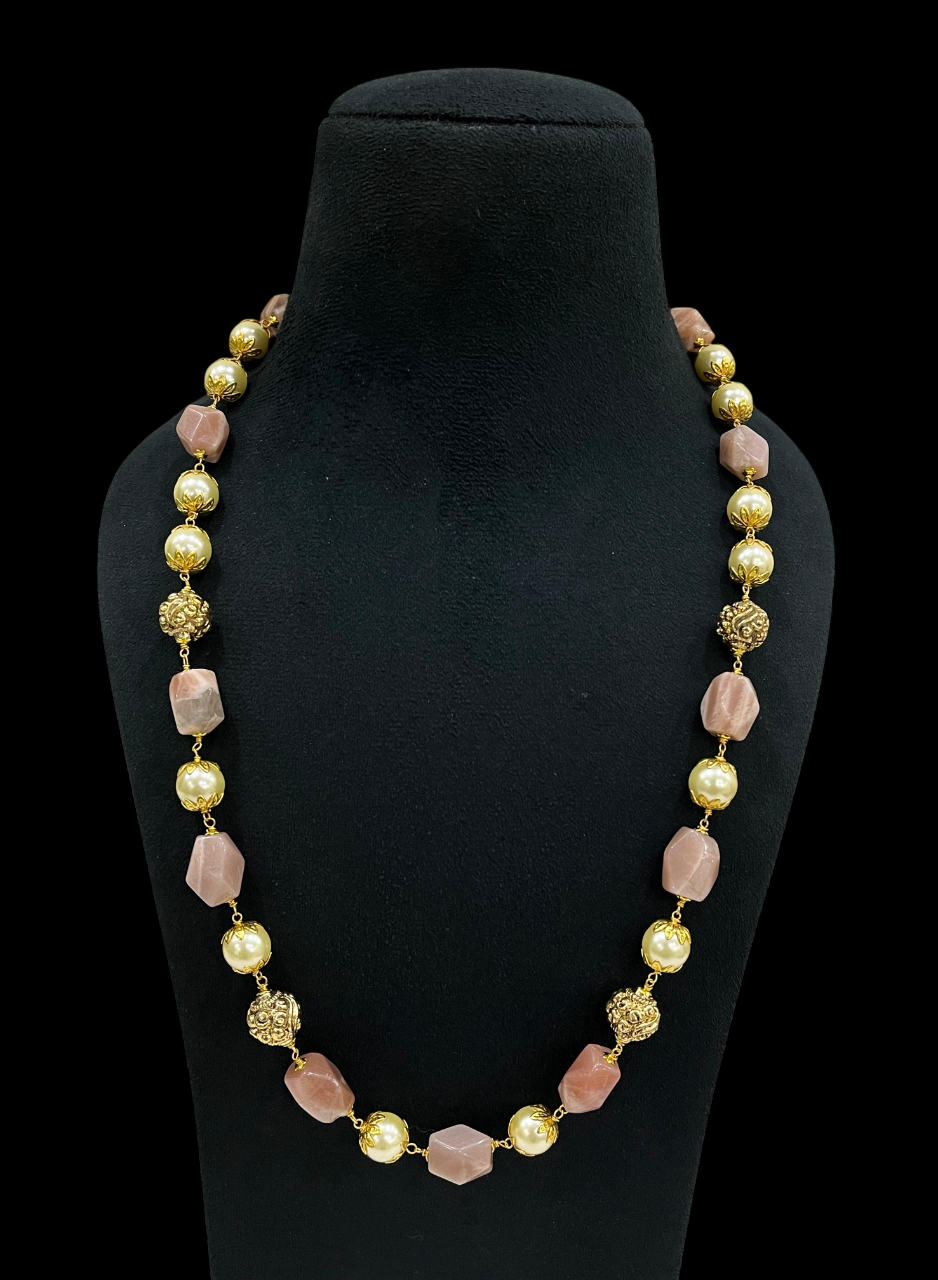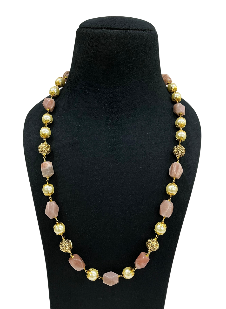 - This stunning rose quartz and pearl beaded necklace combines the soft blush tones of natural rose quartz with lustrous pearls and ornate gold-tone metal accents to create a sophisticated statement piece.