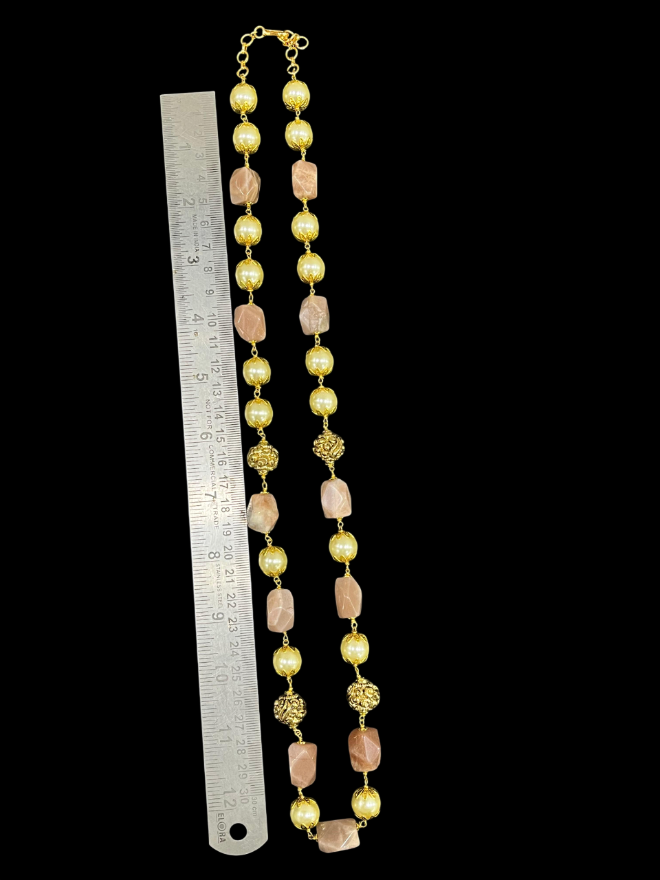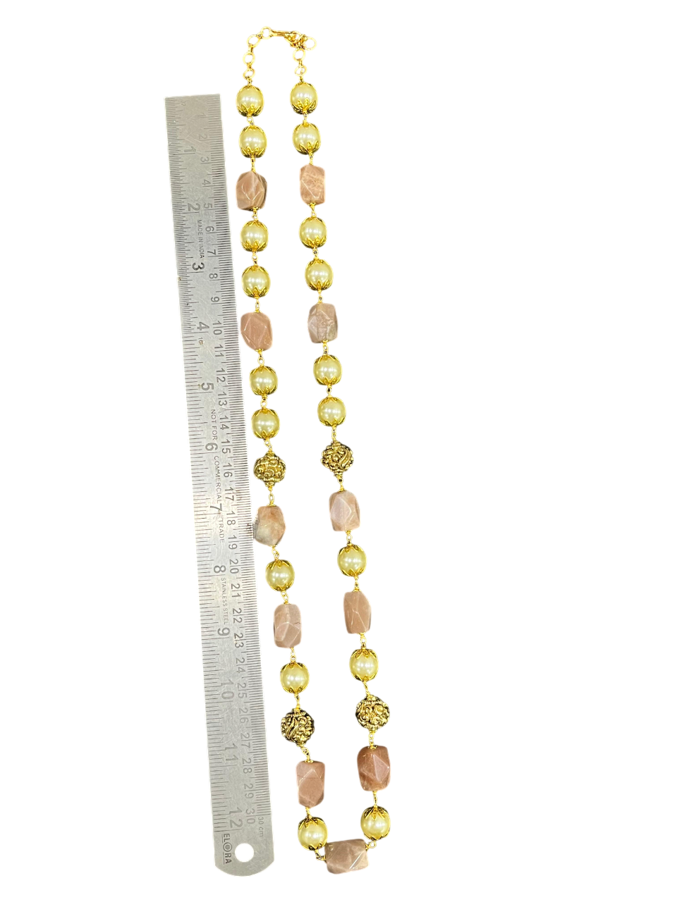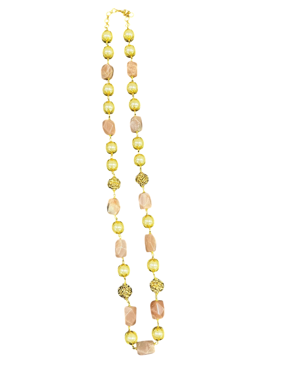 - The alternating pattern of faceted pink rose quartz stones, smooth pearl beads, and intricately detailed gold-tone metal beads creates visual interest and texture that catches the light beautifully.