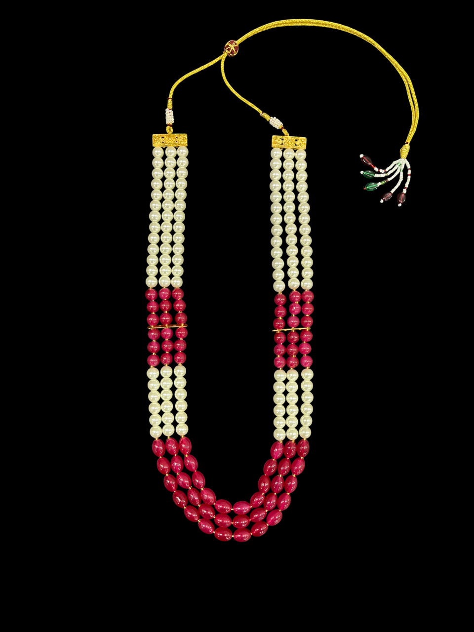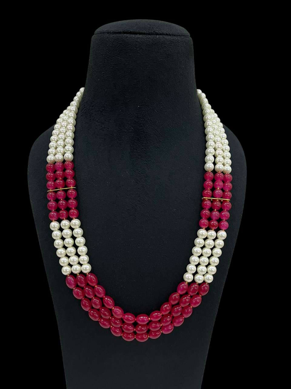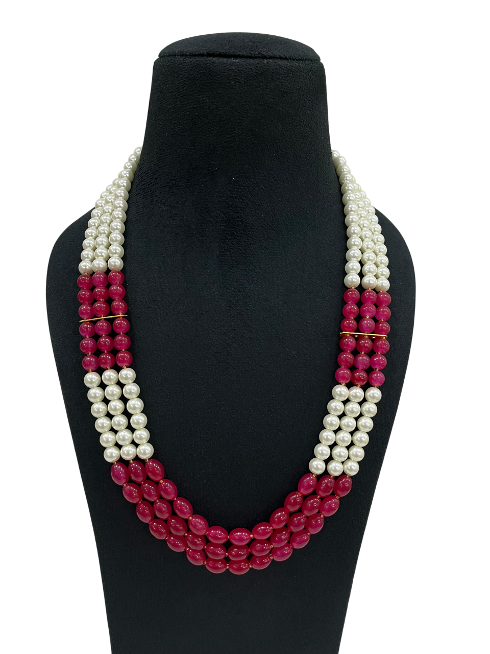 - The three-layer design features alternating sections of cream-coloured pearls and rich ruby red beads, separated by delicate gold accent bars that add a touch of luxury and help define each beautiful strand.