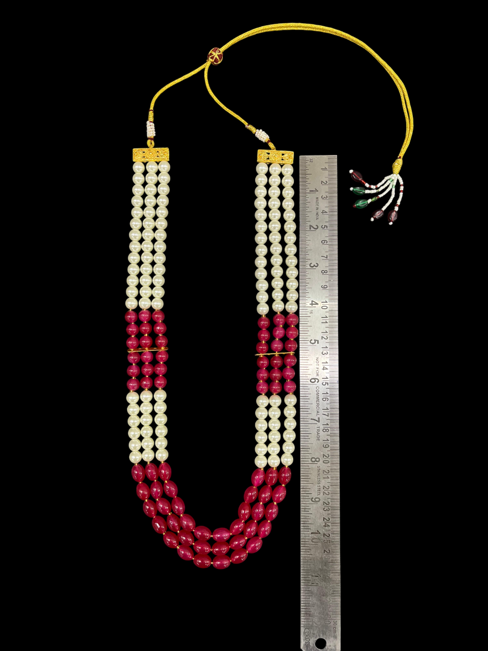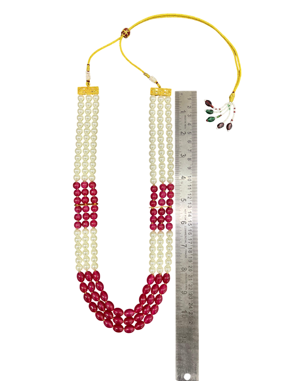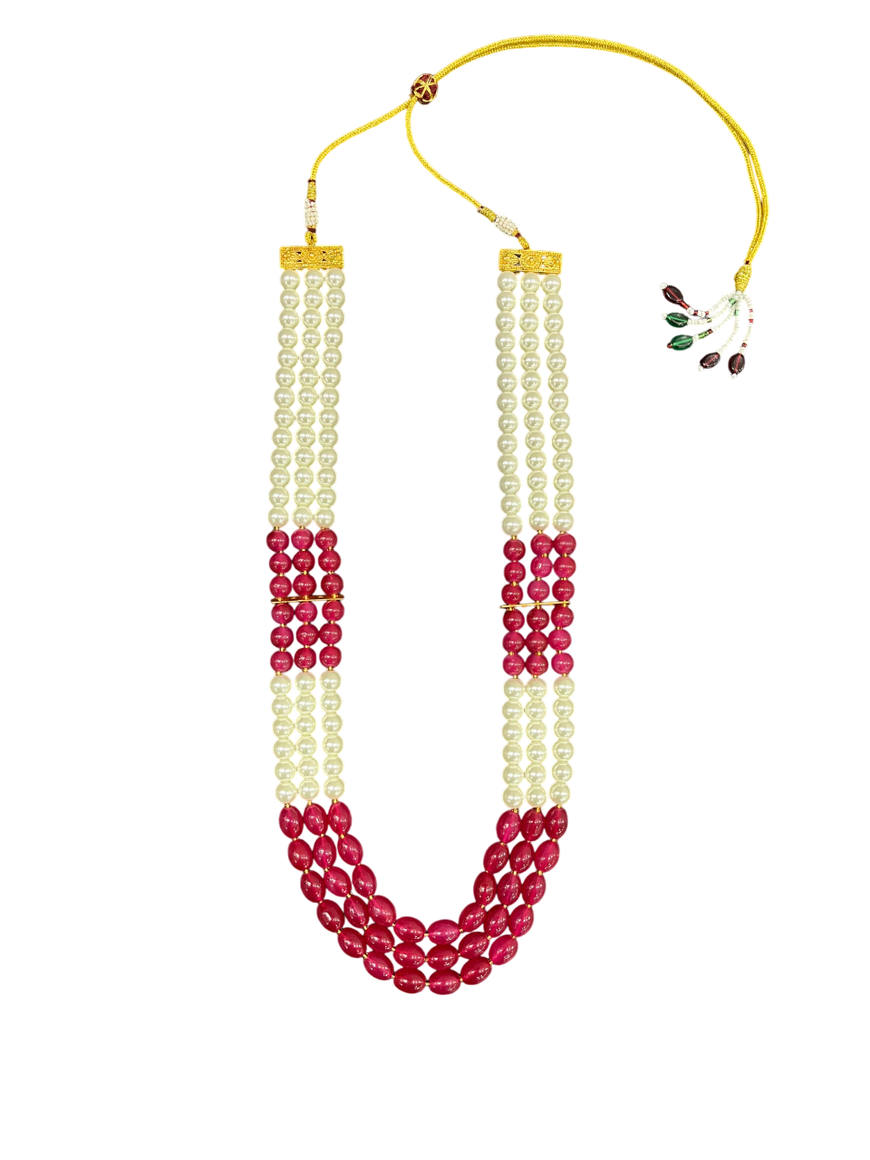 - The three-layer design features alternating sections of cream-coloured pearls and rich ruby red beads, separated by delicate gold accent bars that add a touch of luxury and help define each beautiful strand.