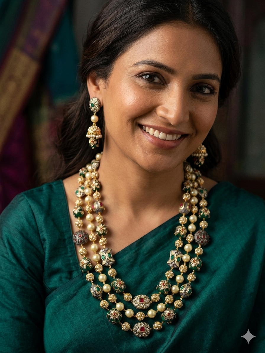 - Metal Beads: Crafted from high-quality metal, ensuring durability and a luxurious shine. Pearls: Features lustrous pearls adding a classic and timeless appeal.