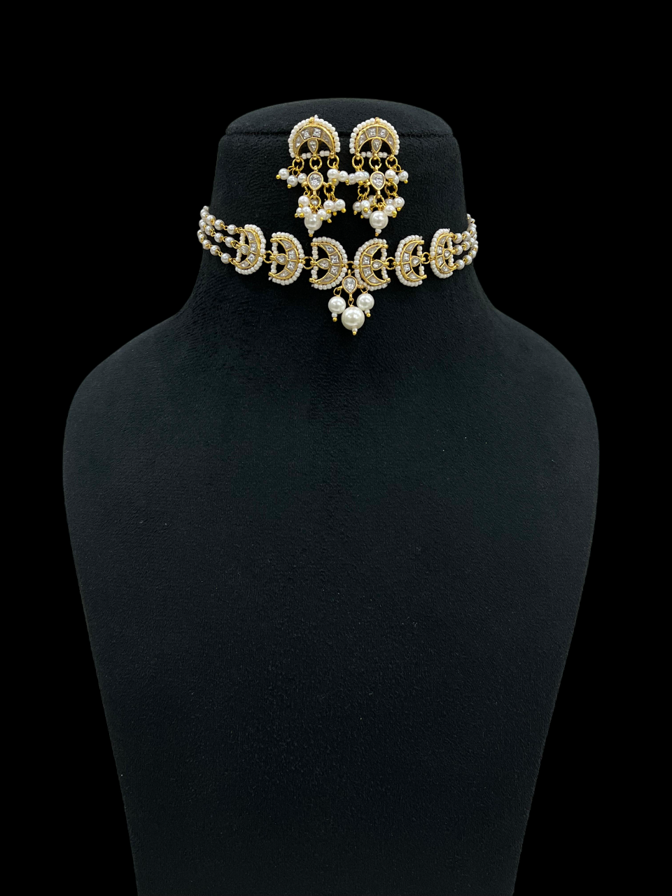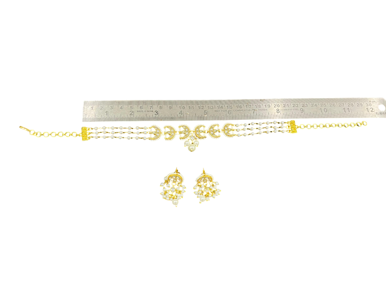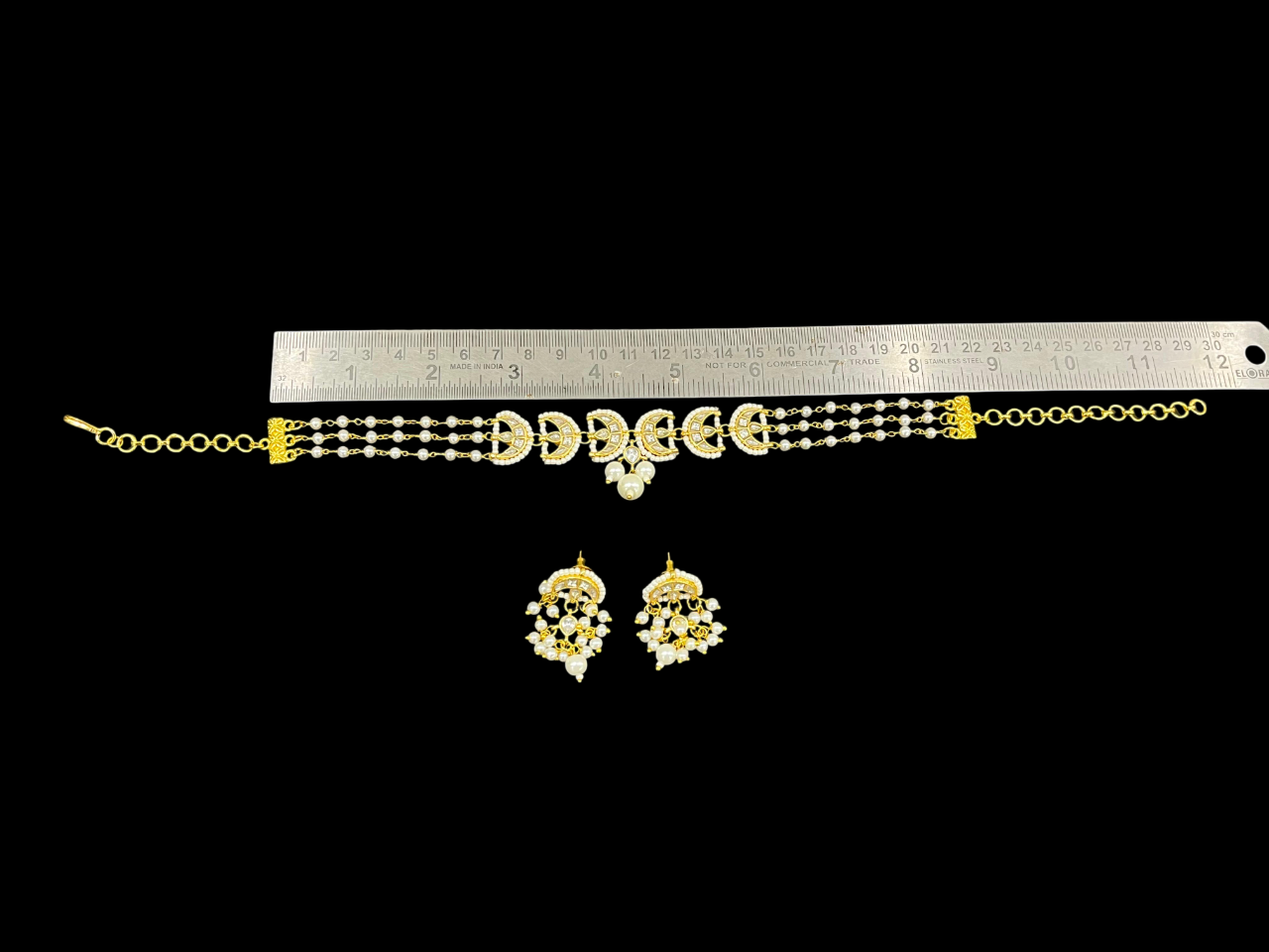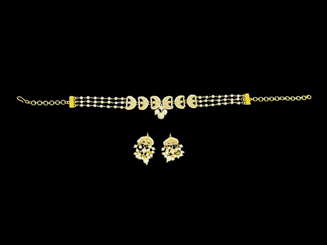 • Complementing the choker perfectly, the matching earrings showcase an ornate design with pearl accents that mirror the necklace’s aesthetic.